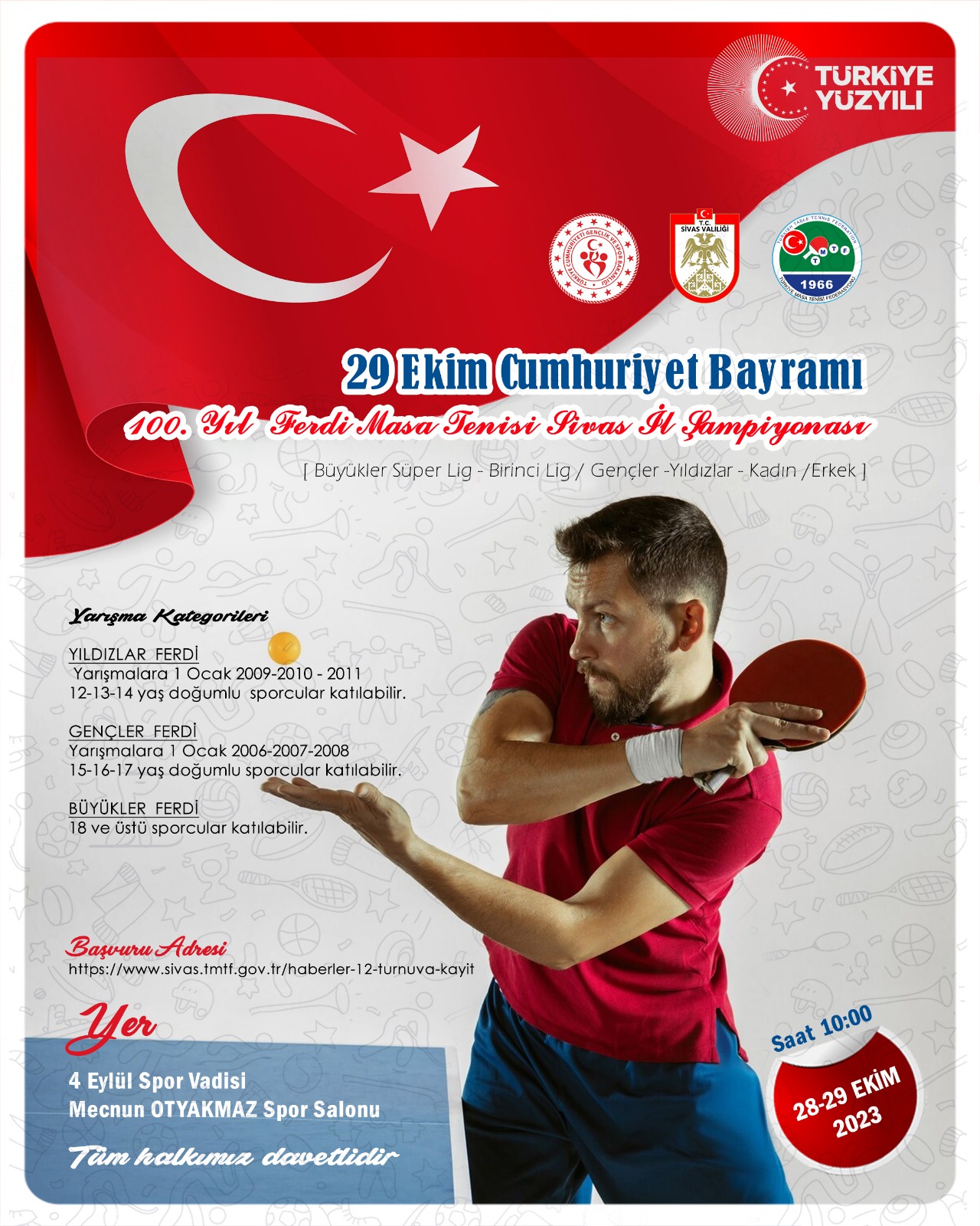 29 Ekim Cumhuriyet Bayramı 100.yıl Ferdi Masa Tenisi Sivas İl şampiyonası 28/29 EKİM 2023 tarihleri arasında yapılacaktır