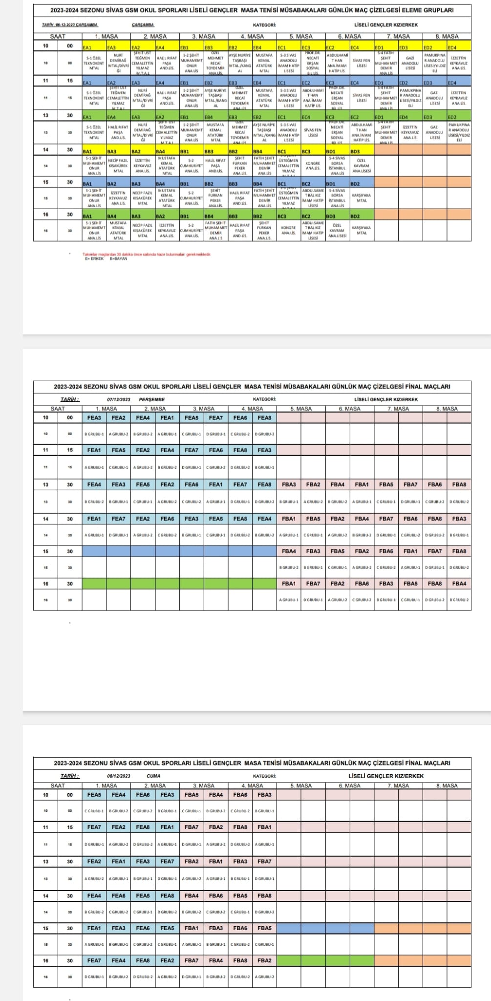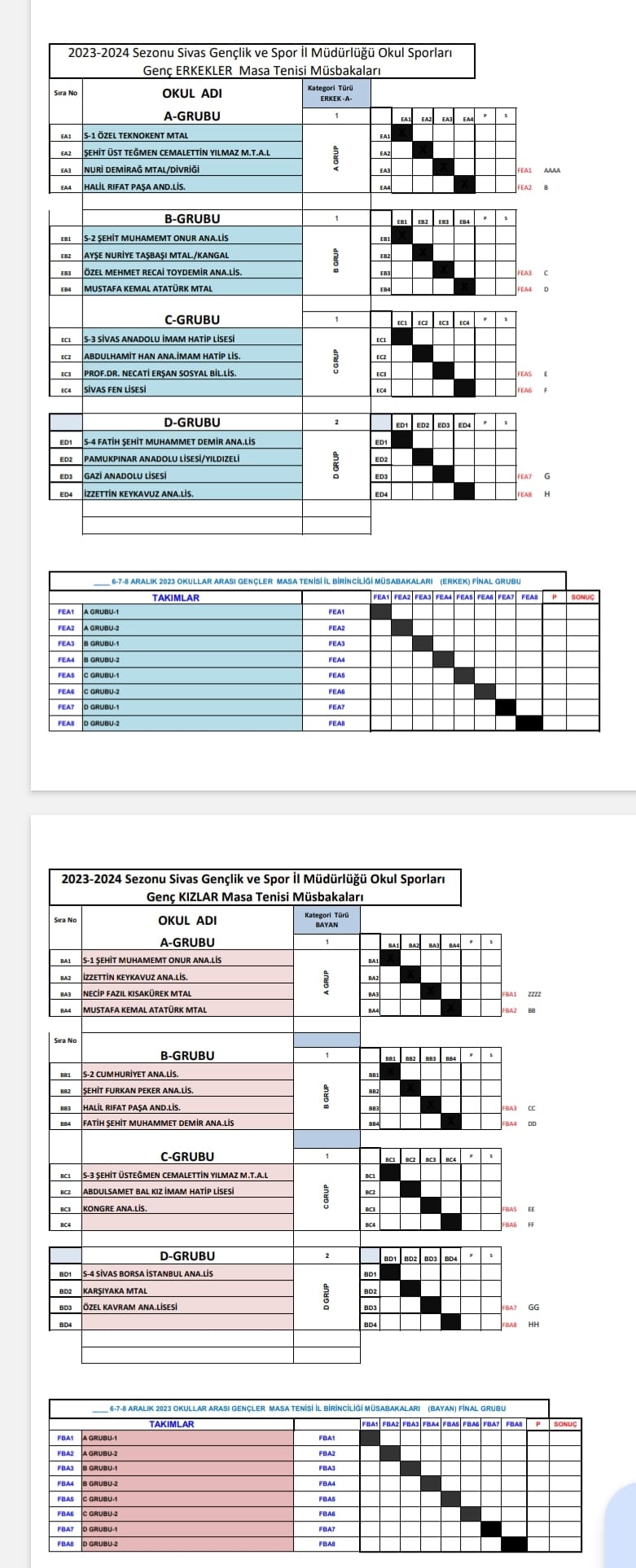 2023-2024 sezonu  Gençlik ve Spor Bakanlığı Okul Spor Faaliyetleri programında yer alan  Liseli Gençler  Masa Tenisi  Müsabakaları 06-08 Aralık 2023 tarihlerinde Sivas Gençlik ve Spor İl Müdürlüğüne Mecnun OTYAKMAZ    Spor Salonunda yapılacaktır. Teknik Toplantı 06 Aralık 2023 Çarşamba günü saat 09.30'da yarışmanın yapılacağı salonda yapılacaktır.Müsabaka Fiksüstürü yazımız ekinde aşağıda belirtilmiştir.